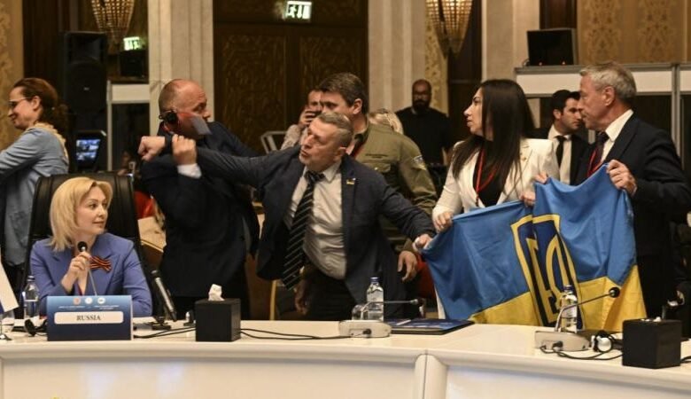 لكم مندوب أوكراني عضوا بالوفد الروسي في وجهه خلال اجتماع لدول البحر الأسود في العاصمة التركية أنقرة بعدما انتزع منه العلم الأوكراني لمنعه من اقتحام مقابلة يجري تصويرها مع رئيسة الوفد الروسي.