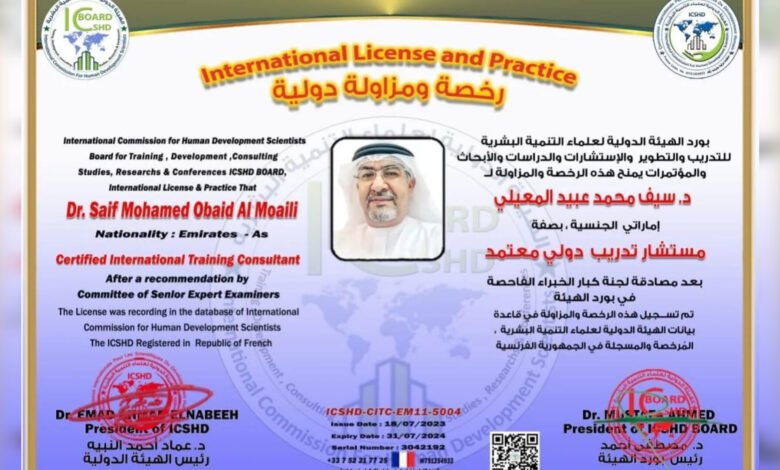 منح بورد الهيئة الدولية لعلماء التنمية البشرية بفرنسا الدكتور سيف المعيلي رئيس مجلس إدارة نادي الفجيرة العلمي اعتماد كمستشار تدريب دولي معتمد