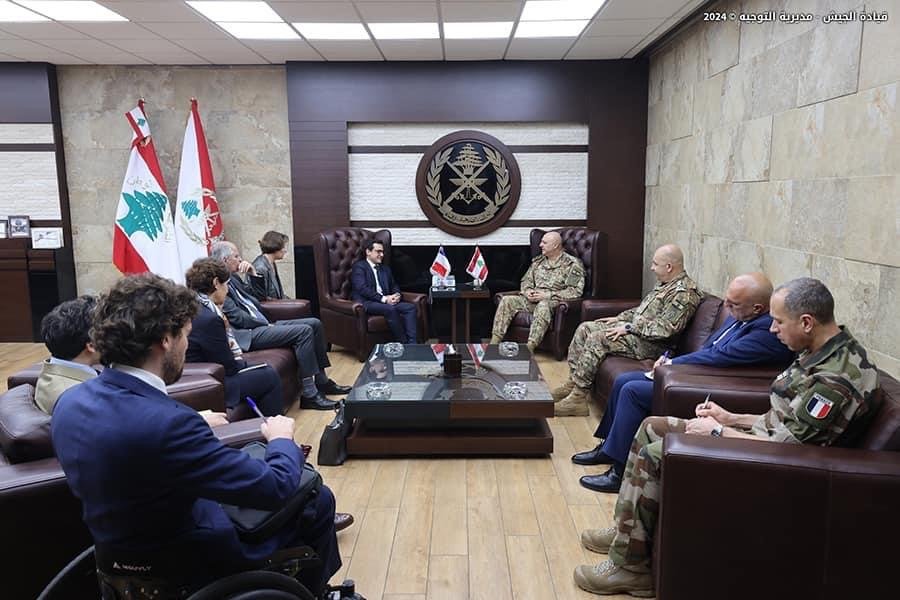 إستقبل قائد الجيش العماد جوزاف عون في مكتبه في اليرزة وزير الخارجية الفرنسي Stéphane Séjourné مع وفد بحضور مديرة شؤون أفريقيا الشمالية والشرق الأوسط في الإدارة المركزية لوزارة الخارجية الفرنسية Anne Grillo، والسفير الفرنسي في لبنان Hervé Magro، وتناول البحث الأوضاع العامة في لبنان والمنطقة والتطورات على الحدود الجنوبية.