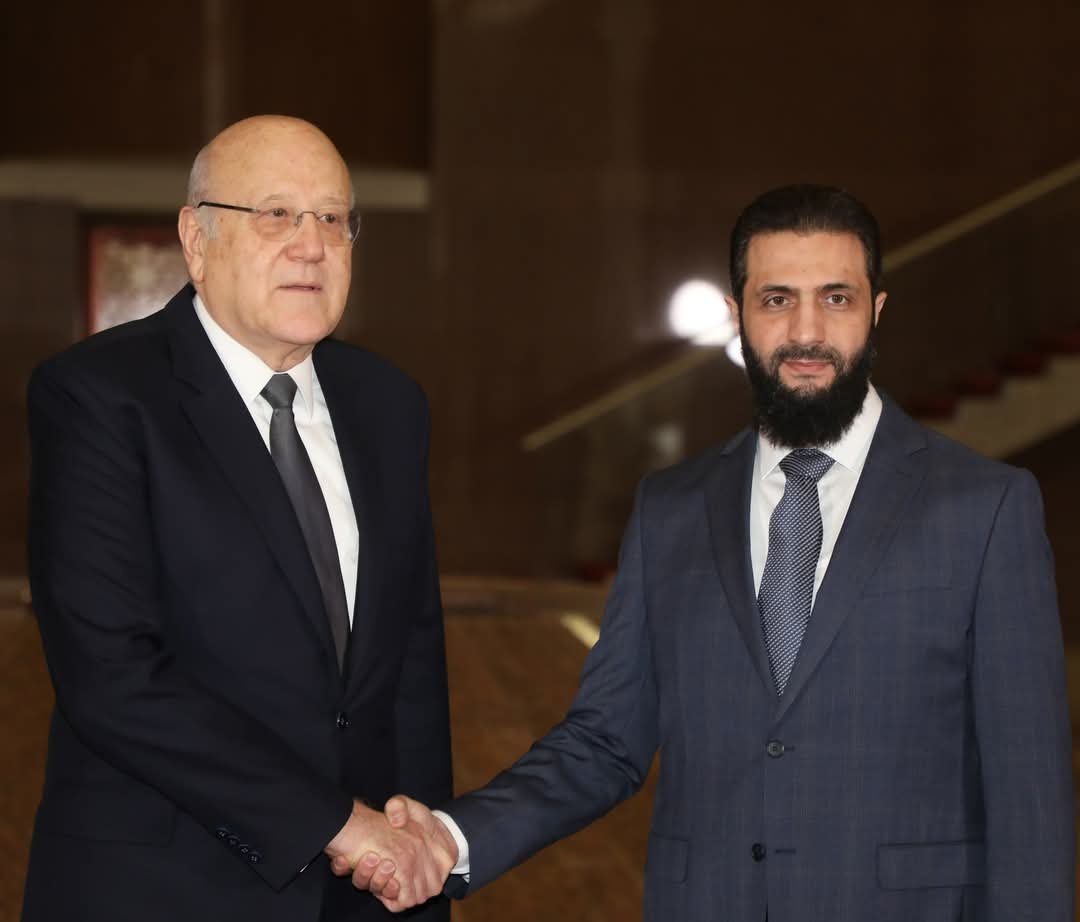 استقبل قائد الإدارة الجديدة في سوريا أحمد الشرع رئيس الحكومة اللبنانية نجيب ميقاتي والوفد المرافق له الذى يضم وزير الخارجية والمغتربين عبدالله بو حبيب، المدير العام للأمن العام بالإنابة اللواء الياس البيسري، مدير المخابرات في الجيش العميد طوني قهوجي، ونائب المدير العام لامن الدولة العميد حسن شقير، اليوم السبت، في قصر الشعب في دمشق.