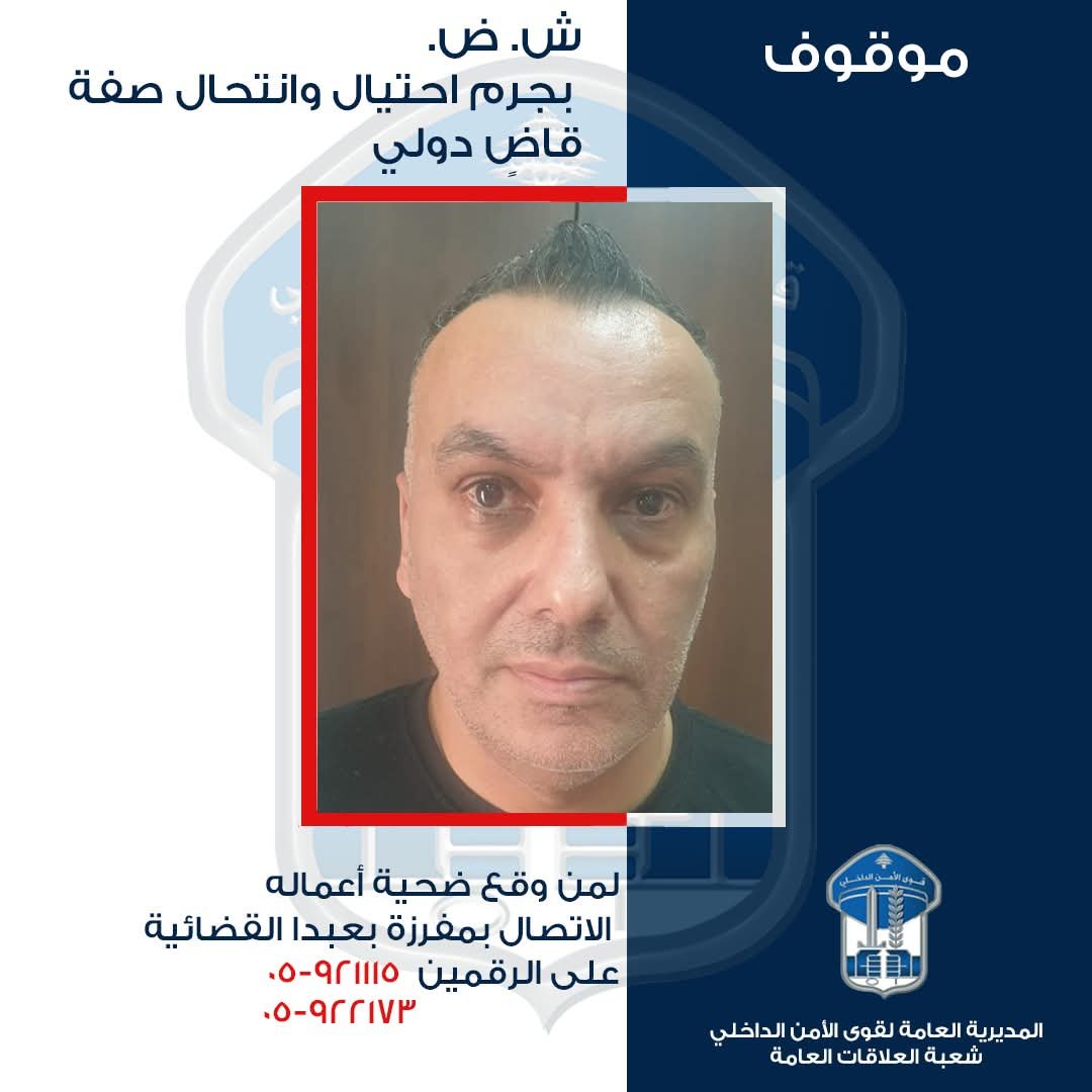 لذلك يُرجى من الذين وقعوا ضحيّته، الاتّصال بمفرزة بعبدا القضائية في وحدة الشرطة القضائية، على الرقمَين التاليَين: 921115- 05 و922173 – 05 تمهيدًا لاتّخاذ الإجراءات القانونية اللازمة بحقّه.