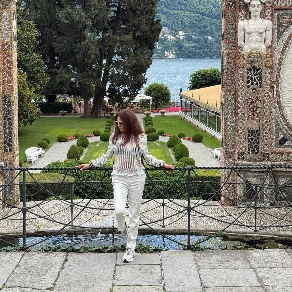 ظهرت #إليسا بإطلالة شبابية أنيقة خلال تواجدها في إيطاليا، حيث ارتدت بلوزة شفافة من قماش شبكي نسقتها مع بنطال أبيض بقصة كلاسيكية. وأكملت اللوك بحذاء رياضي ونظارات شمسية كبيرة.