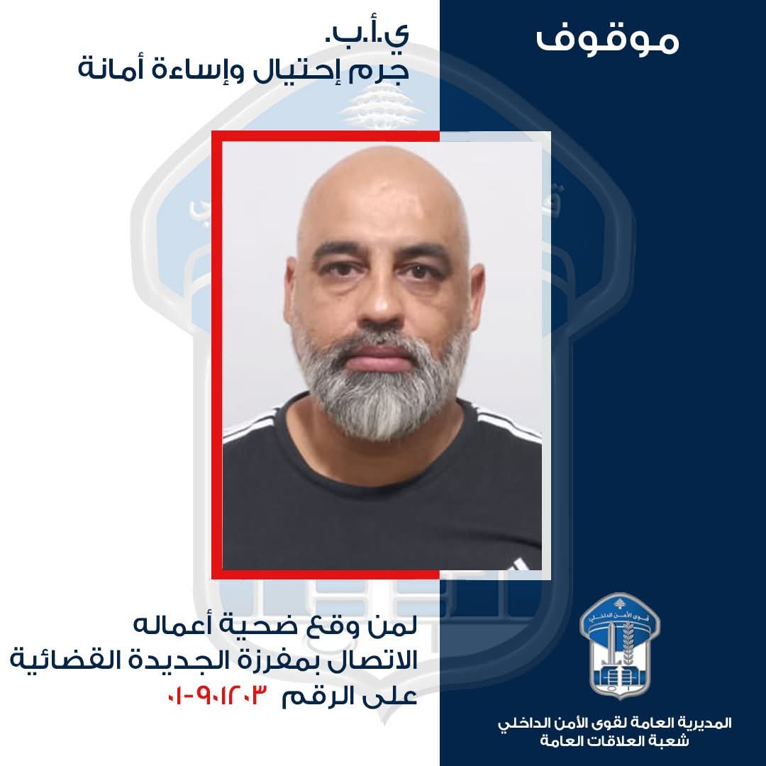 صــدر عـــن المديرية العامة لقــوى الأمــن الداخلي _ شعبة العلاقـات العامةالبـــلاغ التالــــي:في إطار المتابعة المستمرة التي تقوم بها قوى الامن الداخلي لمكافحة عمليات النصب والاحتيال على جميع الأراضي اللبنانية، وبعد ورود العديد من الشكاوى الى مفرزة الجديدة القضائية في وحدة الشرطة القضائية ضد شخص بجرائم احتيال وإساءة امانة، حيث يعمد المشتبه به إلى إيهام الضحايا بامتلاكه شركة إنتاج معروفة، ويطلب تجربة سياراتهم تمهيدًا لشرائها. إلا أنه، وبعد استلام السيارة، يقوم ببيعها بسعر أدنى بكثير من قيمتها الفعلية، ثم يتوارى عن الأنظار.